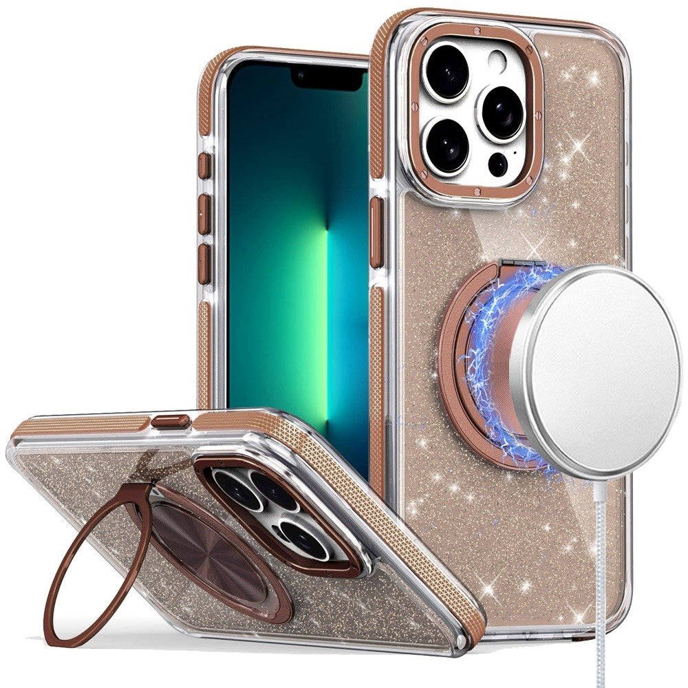 For iPhone 13 Pro Glitz HQ Shimmer Glitter [Magnetic Ring Circle] with 360 degree Rotational Ring Kickstand Tough Hybrid Case – Gold
